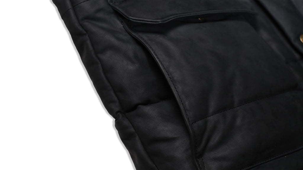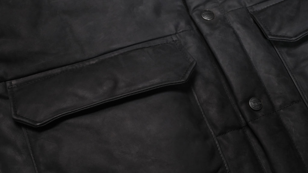 Mechanic vest 70年代のレーシングベストが持つ、無骨で普遍的なアメリカンスタイル。 その輪郭を、TENJIN WORKS独自の解釈で“レザーのベスト”として再構築した一着です。 表地には、希少性の高いブラッシュドキップレザーを採用。 きめ細かく密度の高いキップレザーをブラッシュし、通常の倍量のオイルを含ませ、適正温度でプレス。 傷がつきにくく、日常のケアは乾拭き程度で十分。 着込むほどに自然なアタリと艶が生まれ、唯一無二の表情へと育っていきます。 本来は中綿ナイロンで作られるレーシングジャケットの構造を、 レザー × 中綿という前例のない製法で実現。 素材を先に完成させてから縫い上げる独自工程により、 従来のレザーベストとは一線を画す軽さと着心地を備えています。 加えて、キップレザーの特性であるキメの細やかさによる防風性の高さから、中綿とのコンビで充分な防寒性を保ってくれます。 襟は開閉によって表情が変わり、立ち襟、タートル、通常襟と自在にアレンジ可能。 腰のフラップ付きパッチポケットは、サイドからも手を入れられる実用的な設計。 ボタンには、使い込むほどに風合いが増すラッカー仕上げのオリジナルツープロングボタンを採用しました。 クラシックでありながら、他に似るものがない。 時間とともに完成していく、着るためのヴィンテージです。